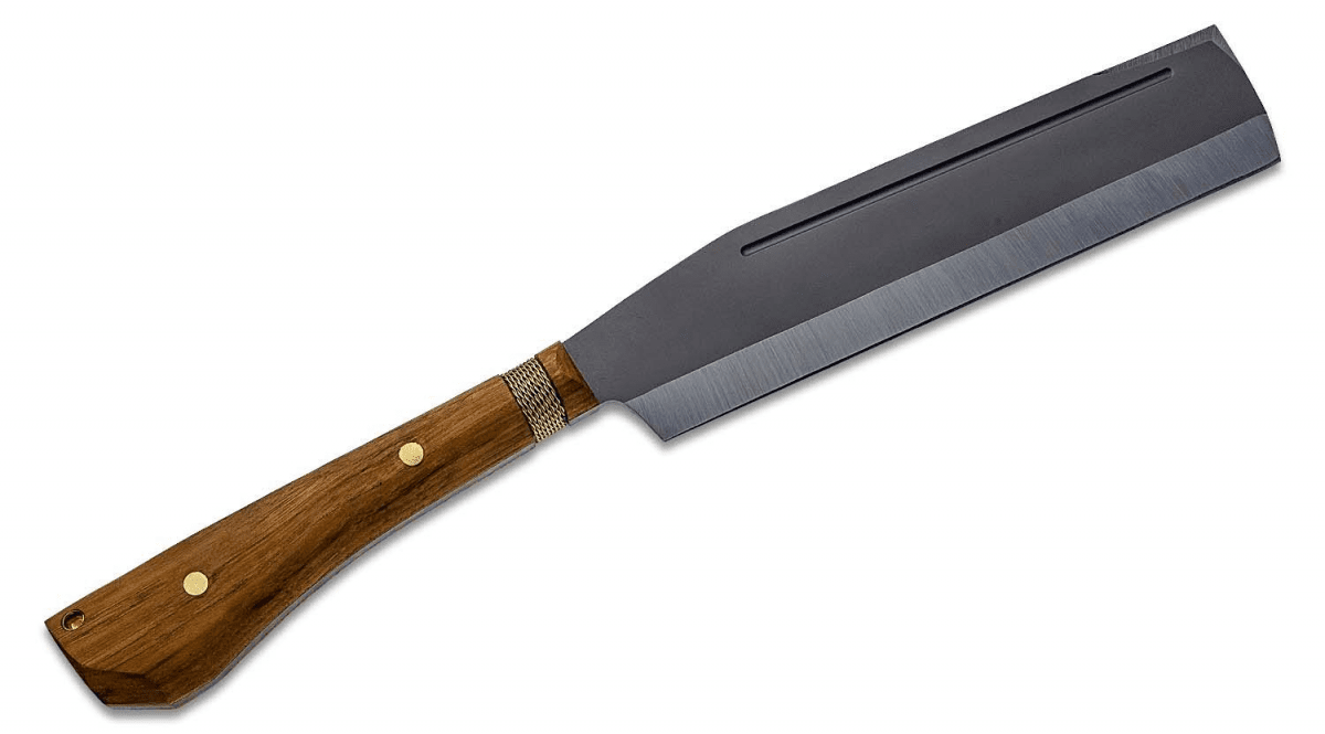 With an American hickory handle and a braided wrap near the top to protect the haft of the 5 mm thick blade, this full-tang version of the Nata boasts a 10" blade ground on both sides. This modern take on the classic tool comes complete with a full-grain leather sheath.
