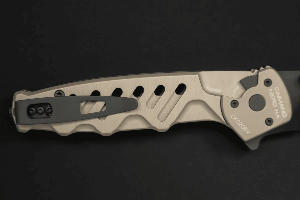 The end of the handle is designed to improve the grip for quick extraction of the knife from the pocket. There is also a glass breaker in hard metal. The DLC-coated titanium clip can be positioned at three different angles on both sides, and is designed to minimize the bulk of the handle outside the pocket.