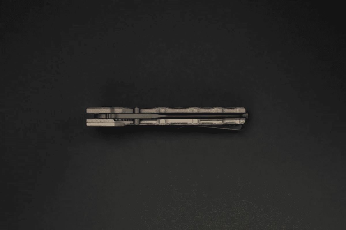 The handle is made up of 2 scales in anticorodal aluminum material anodized in Tactical Mud color.