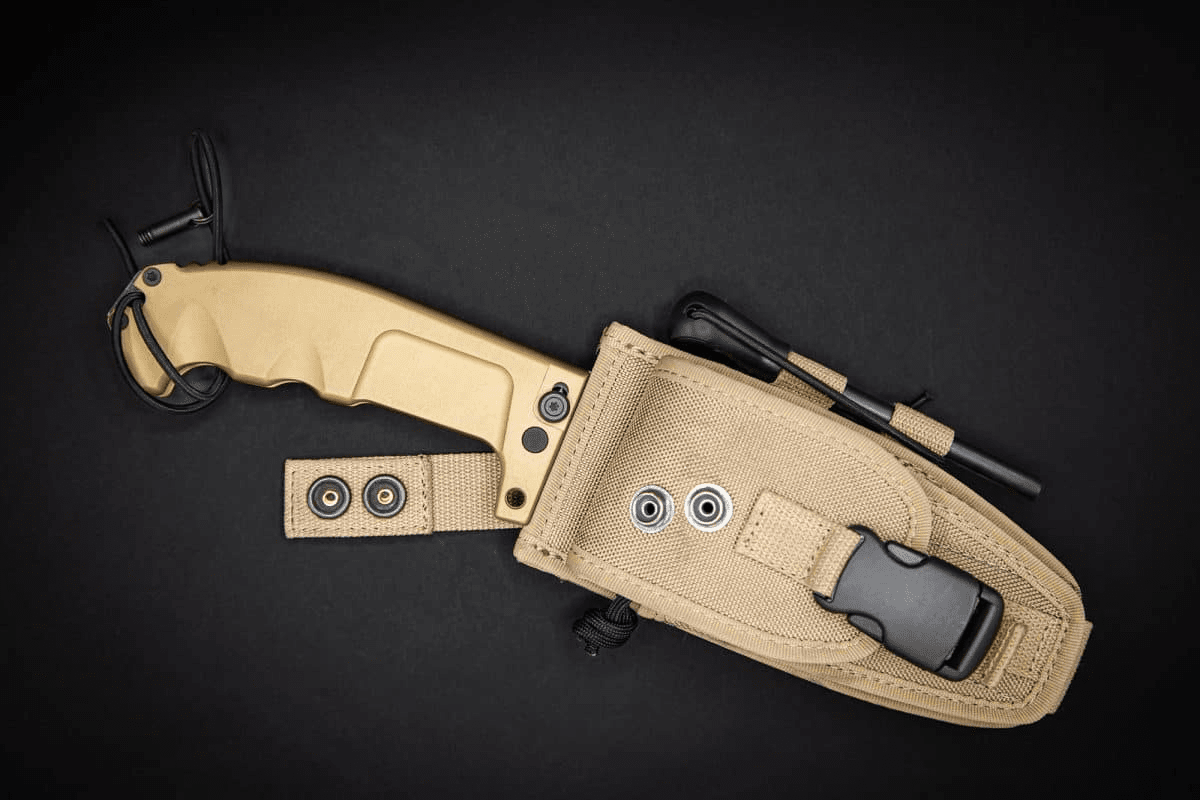 By screwing the pin in this location, maximum safety is guaranteed to the user. All models in the Expeditions series are accompanied by desert-colored sheaths and are supplied among the various tools with a firesteel for lighting fires.