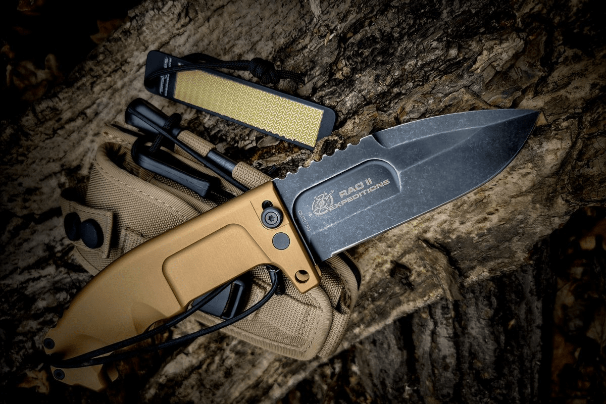 RAO II Expeditions is no exception and comes with a desert cordura sheath which is an essential component of the carry system. This particular sheath allows you to carry the knife with the blade closed by placing it in the appropriate front pocket, or with the blade open by inserting it into the dedicated compartment which features a safety system consisting of a lace with double clip. In addition to the firesteel there is also a diamond resharpener.