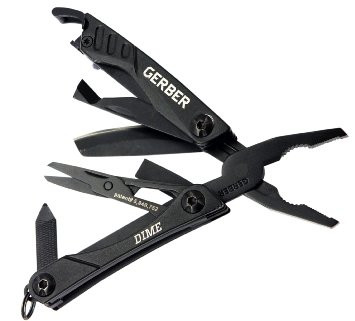 Dime Micro Multi-Tool Black - 2 3/4" closed. Ten 3Cr13 stainless components: pliers, wire cutter; blade, package opener, scissors, medium flathead driver, crosshead driver, bottle opener, tweezers and file. Keyring. Black aluminum handles. Compact and lightweight. Weighs 2.2 oz.