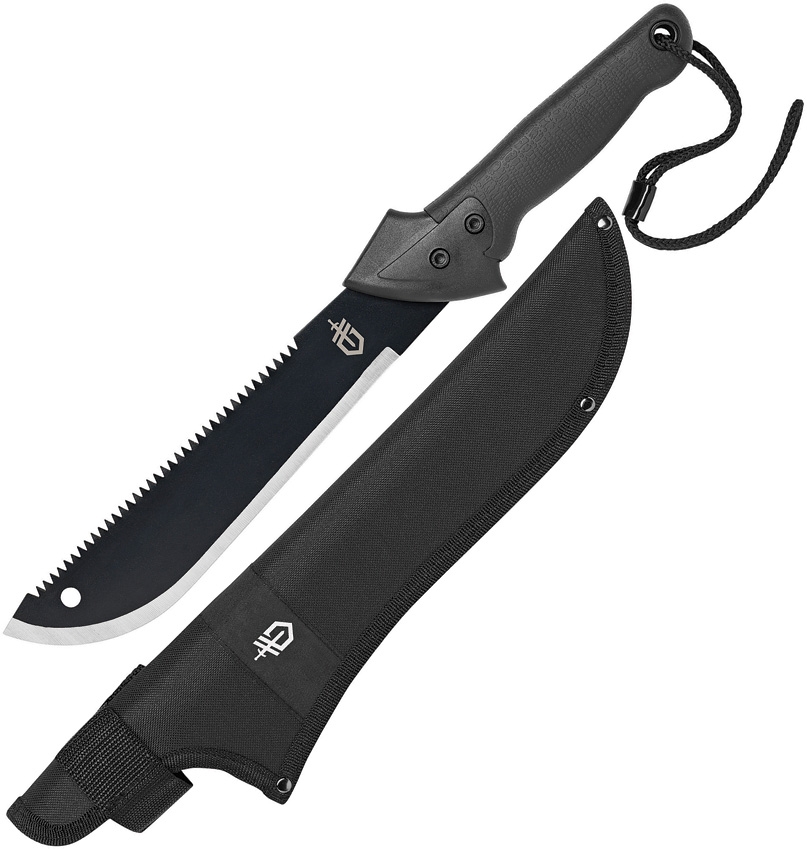 Gator Machete har ett tvåsidigt blad med en skarpslipad egg samt en sida med sågblad. Macheten har oxidtäckt stål och gatorseriens ergonomiska gummi grepp. Fodral i förstärkt nylon medföjer.