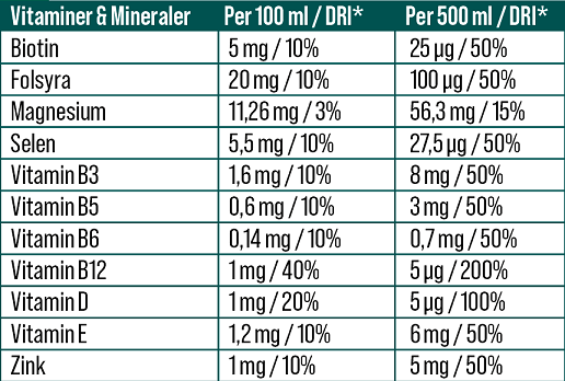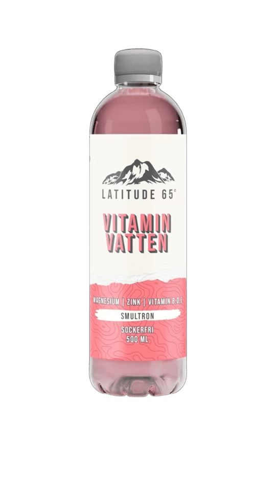 | Ingredients | Water, acidity regulators (citric acid, malic acid), vitamins/minerals (magnesium citrate, vitamin C, zinc citrate, vitamin E, niacin, pantothenic acid, selenium, vitamin D3, vitamin B6, folic acid, biotin, vitamin B12), Smultrona flavor, sweetener (sucralose), coloring (E163, E133), preservatives (E202, E211). |