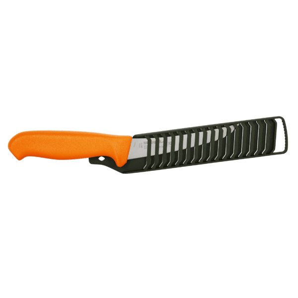 The ergonomic polymer handle in a hunting inspired colour features a friction grip, finger guard and a 1.85 mm thick blade that provides both strength and stability in every cut and slice. The blade and handle design makes it ideal for working safely and efficiently in various weather conditions during hunting throughout the year. The polymer sheath in a matching hunting colour has a practical lock function and is easy to rinse.