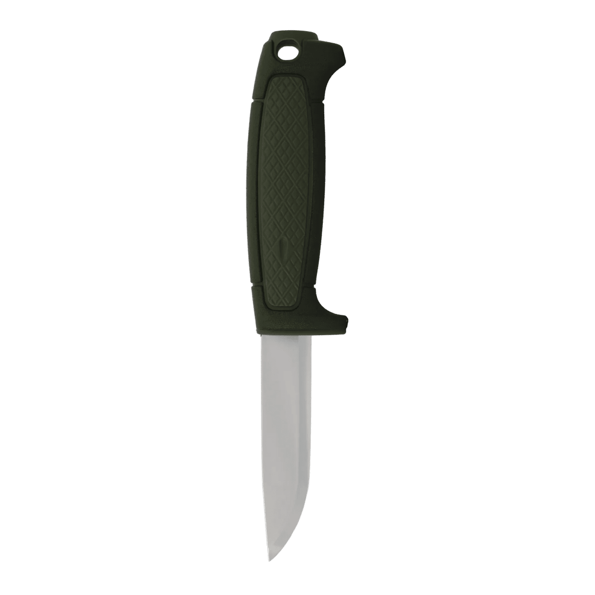 The ergonomic handle is made entirely of durable polymer (PP) that withstands moisture, dirt, and cold. The finger guard ensures safe handling, and the hole at the end of the handle makes it easy to attach a cord or paracord. The sheath features a smart click-lock function and can be worn on either the right or left side. It can also be attached directly to the button on your outdoor trousers.