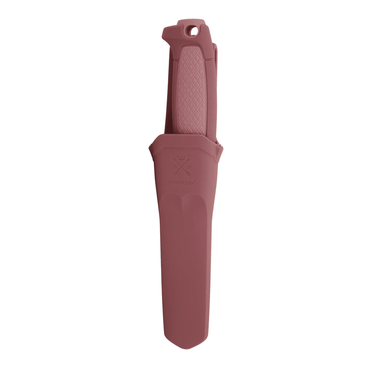 The ergonomic handle is made entirely of durable polymer (PP) that withstands moisture, dirt, and cold. The finger guard ensures safe handling, and the hole at the end of the handle makes it easy to attach a cord or paracord. The sheath features a smart click-lock function and can be worn on either the right or left side. It can also be attached directly to the button on your outdoor trousers.