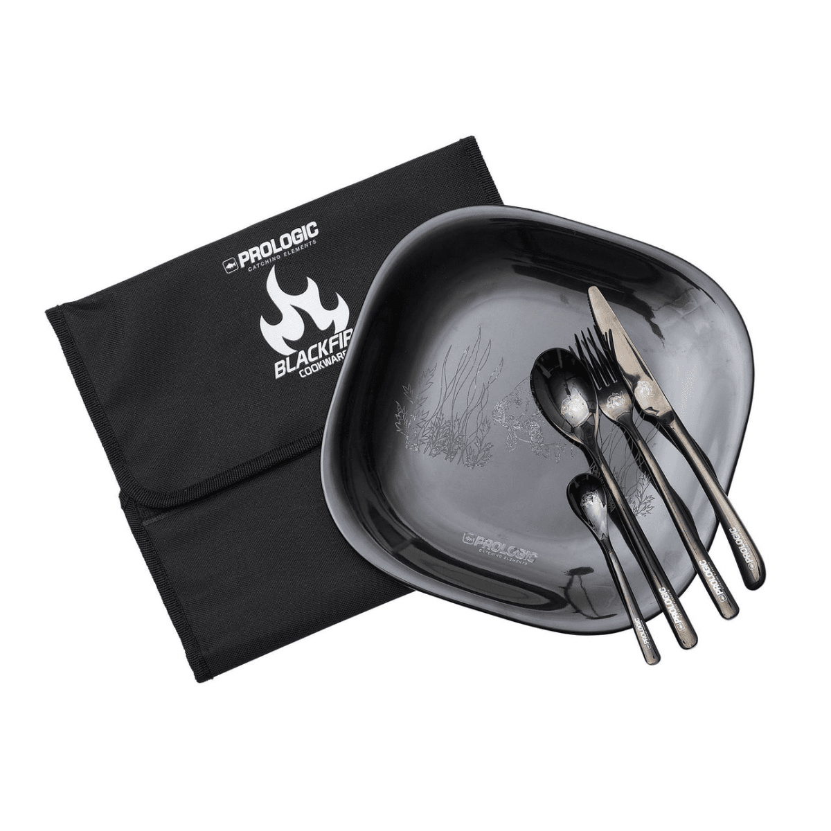 The set includes stainless steel cutlery and a large, impact-resistant plate, all finished in the sleek Blackfire design with eye-catching details. Everything is neatly packed in a practical, foldable storage case, making it easy to carry and keep organized.