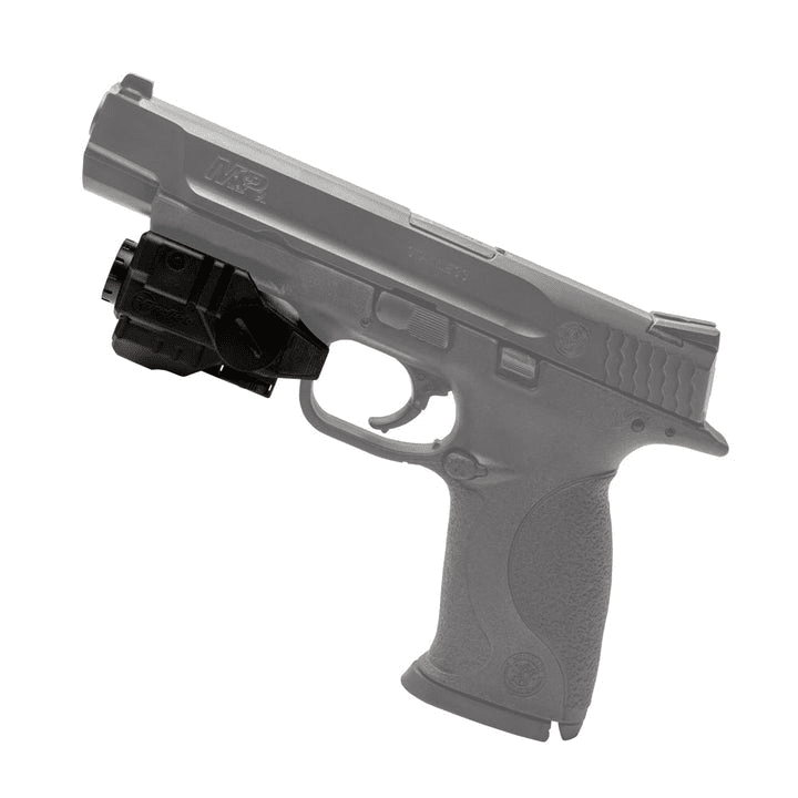 - A 150-lumen LED flashlight identifies targets and temporarily disorients intruders