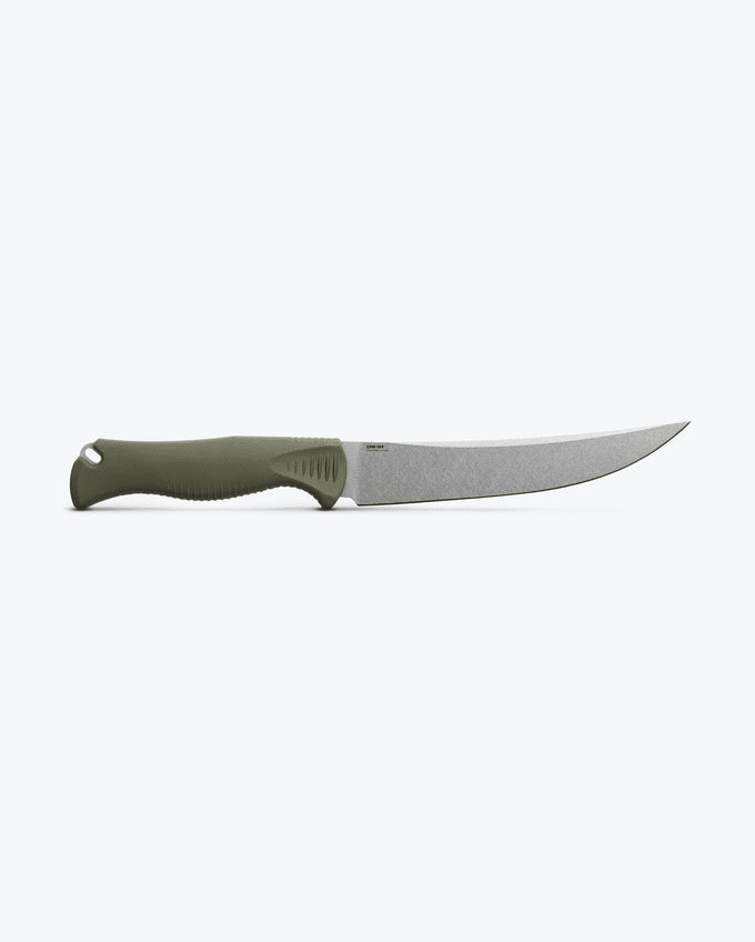 The seasoned hunter’s go-to hybrid fixed blade knife for trimming, deboning, and slicing game in the field, the new 15500-04 Meatcrafter® variant gets to work with a six-inch CPM-154 stainless steel trailing point blade with a Stonewash finish, the perfect balance of wear resistance, corrosion resistance and toughness. The ergonomic Dark Olive Santoprene® handle provides a sure grip in wet environments and its two-piece Boltaron® sheath gives you two color options for safe carry on your hip or pack, high-vis Orange or low-profile Gray for a more camouflaged approach. Engineered ultra-sharp with SelectEdge® technology, the Meatcrafter® is fine-tuned for effortless cuts from one hunt season to the next.