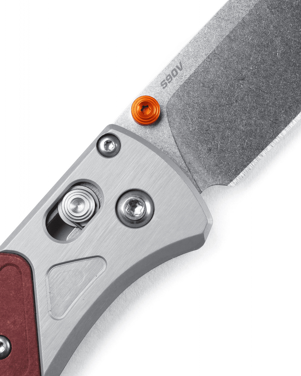 We decided to mix it up a little bit with this premium Bugout® and, like, literally mix some materials. Inspired by the earthy tones found in our outdoor gear, backpacking kits, and accessories around the campsite, the new 535-09 Bugout® sets itself apart from others we’ve built thanks to handle scales that contrast a gray anodized 6061-T6 aluminum bolster with a Redstone Richlite onlay, plus a few other added pops of color found in the orange anodized thumb stud and backspacer. Featuring a premium CPM-S90V stainless steel stonewash polished blade, this unique 535-09 Bugout® has the same stunningly lightweight and compact feel as its predecessors and remains the ideal EDC on any outdoor adventure from the mountain trail to tasks around town. Over time, Richlite®, a paper composite material, will develop a natural patina over time, altering the original color of the material. "Patina” is a natural occurrence in the product that can either darken or lighten depending on exposure to light.