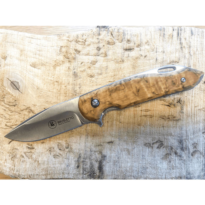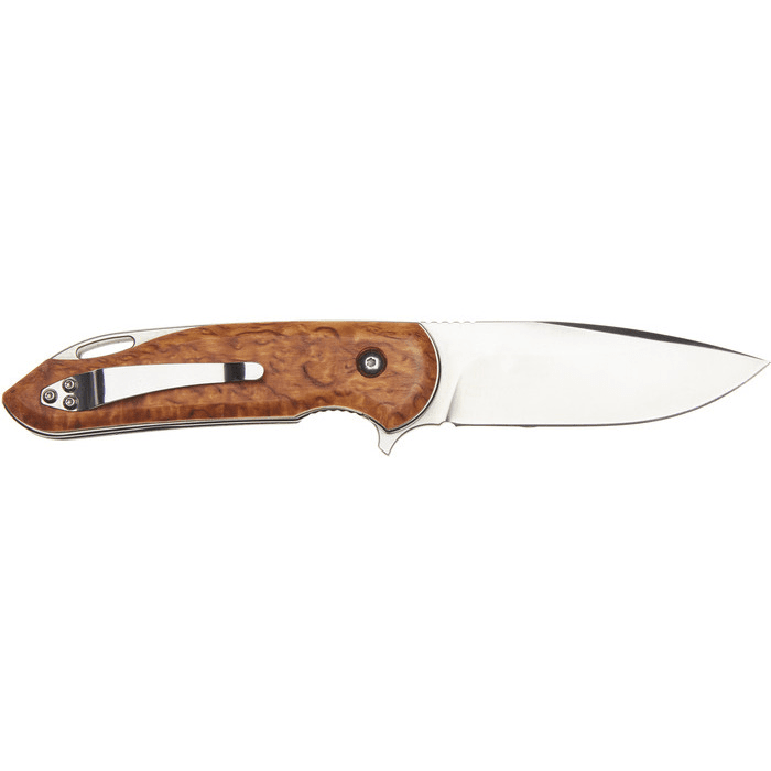 Brusletto Natten is an elegant and stylish folding knife. The knife is opened and locked easily with the thumb button. The knife blade has a Scandinavian shape and is made of brushed 12C27 Sandvik Steel with ceramic wheel bearings. The knife blade is secured with a Liner cap in the open position and this makes it very safe to use. On the back of the knife there is a pocket clip and a practical hole for attaching string, ring or hook. The side plates are made of oiled Masur birch. Clean the knife after use so that it stays nice for as long as possible. The folding knife suits everyone from the outdoor enthusiast to the home fixer or someone who just needs a sharp friend.