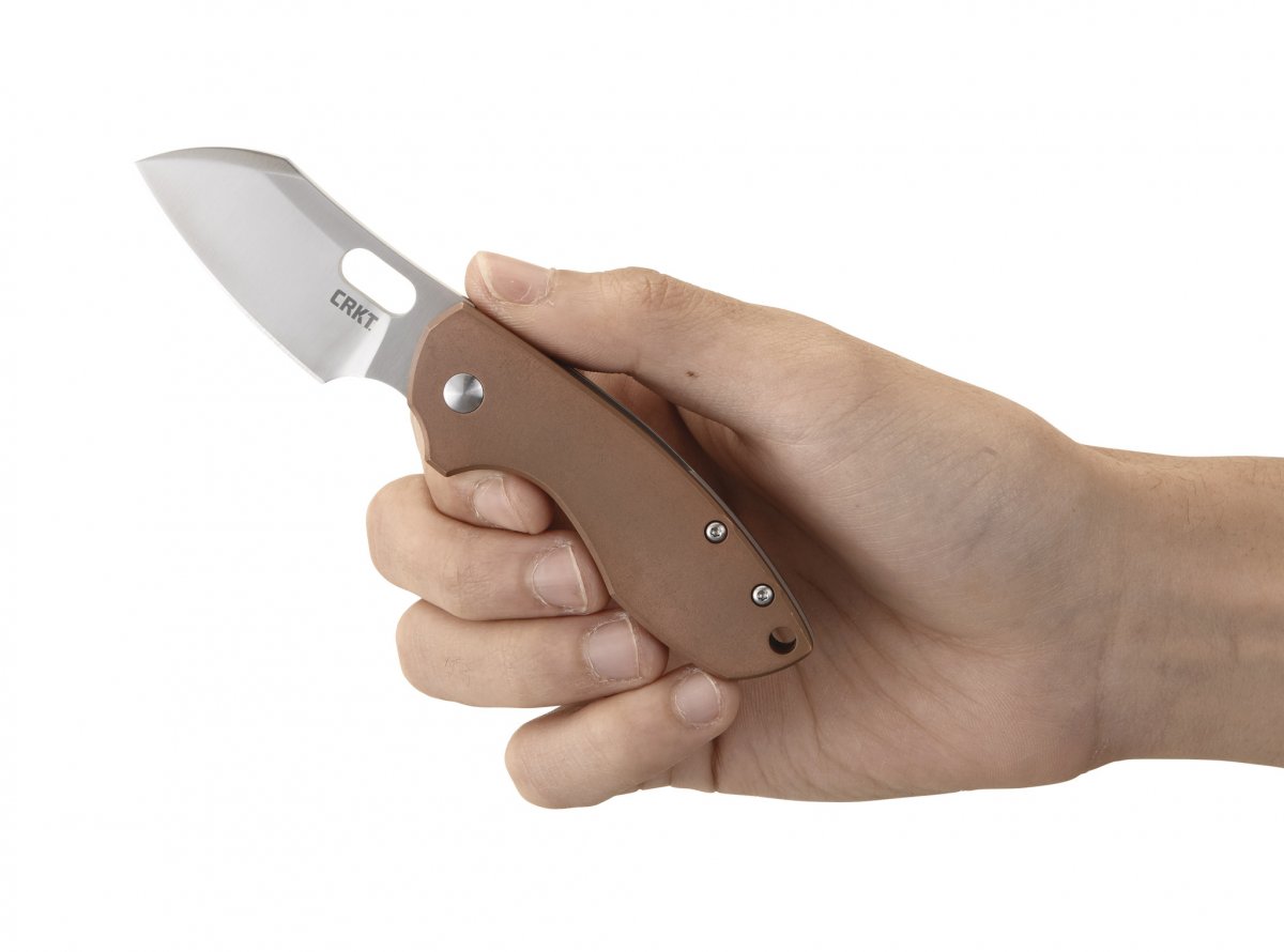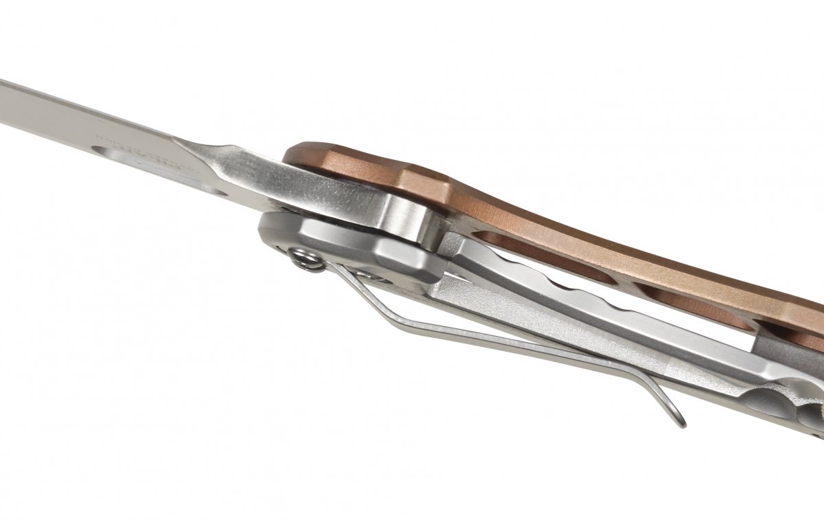 The 61mm flat grind blade features a satin finish and the fine, but strong tip is useful for more detailed tasks. The front of the handle is copper, the back is stainless steel for an eye-catching, two-tone look. A thumb slot opening mechanism deploys the blade and it’s secured with a frame lock for your safety.