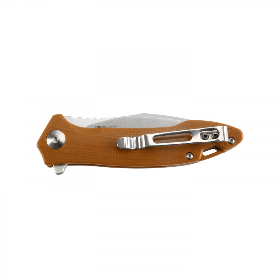 Firebird FH51 handle is made of two linings from G10 which are intertwisted by several bolts. They have a smooth-rounded shape which is the most convenient for keeping a knife in the palm and its long use. The lining surface is specially made rough, so that the grip of the knife is sturdier, and it does not slide in wet palms or gloves. As for the color, 3 options are available for customers at once: black, blue and brown. A through hole is provided in the tail end of the handle for threading lanyard through it. Also, a clip is screwed to one side of the handle.