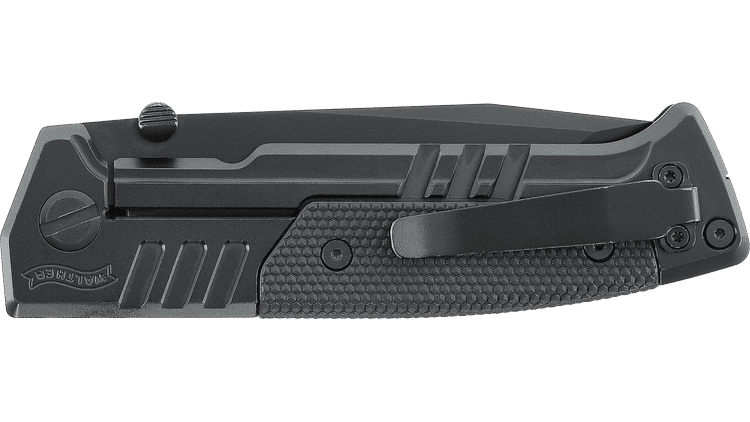 The heart of the knife is the coated, partly serrated tanto blade made of edge-retaining D2 steel. Its length of 92 mm and thickness of 3.6 mm make it perfect for tough everyday jobs, special operations and outdoor activities. The blade is held in place by a stainless steel frame lock and opened by means of a detachable dual thumb stud. The opening aid is modeled on the magazine release of the Walther PDP pistol.