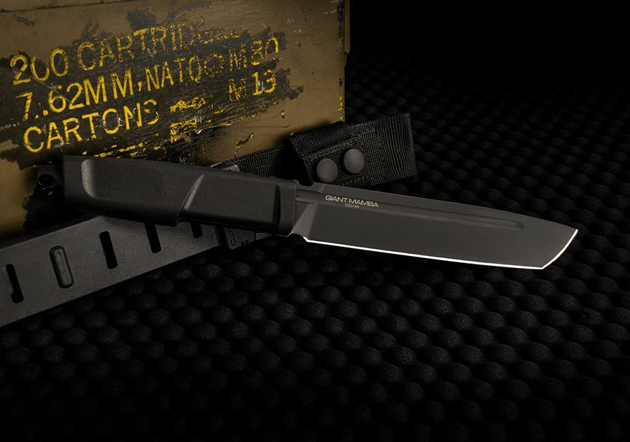 The Giant Mamba has a 6.3 mm thick Böhler N690 steel tanto blade with 58 HRC hardness, flat edge and full length lightening shell, black or Stone Washed. The Forprene handle with threaded tang lock makes the knife solid and well balanced.