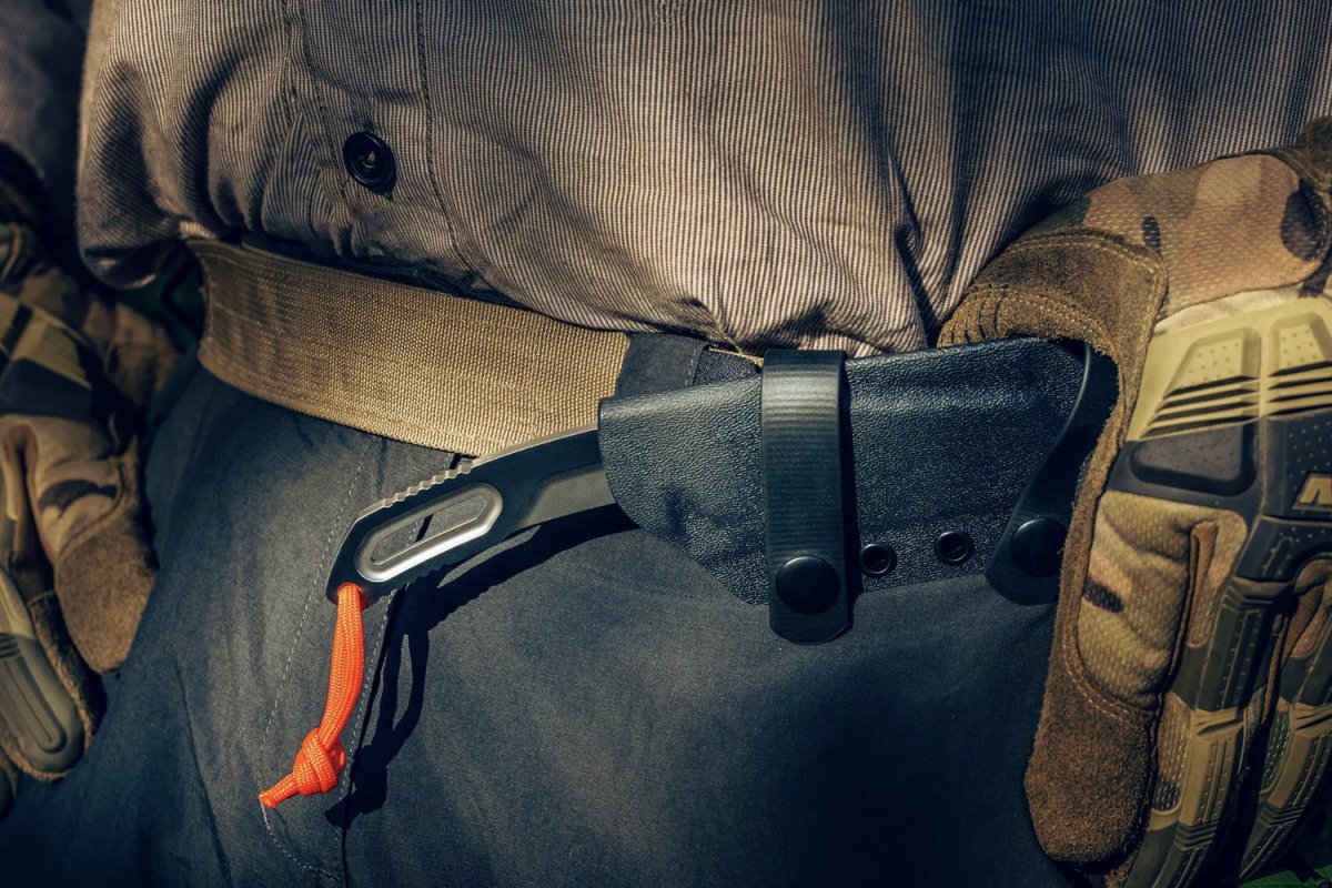 - Ambidex Kydex sheath with double loop with buttons for belt attachment