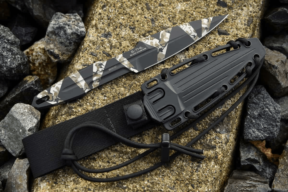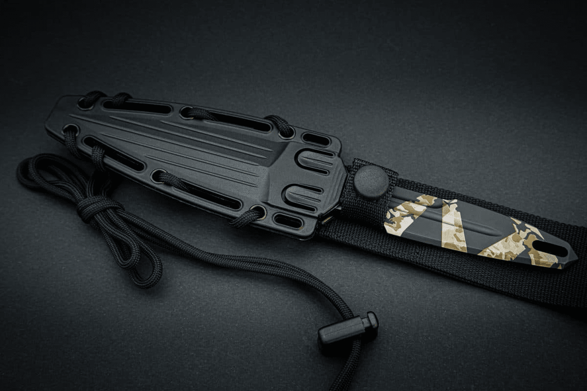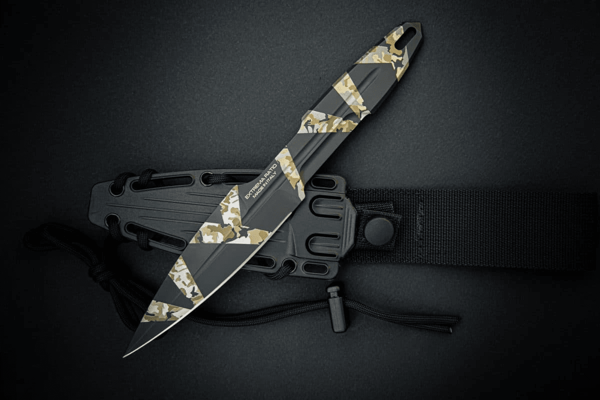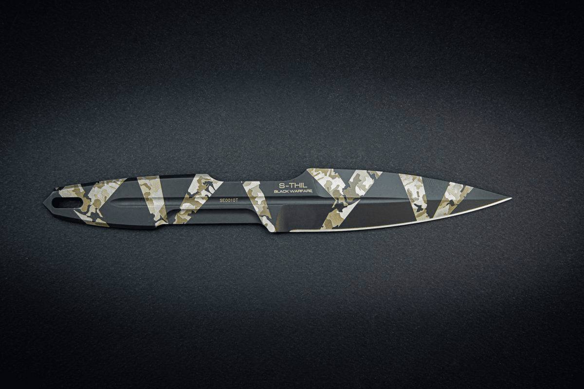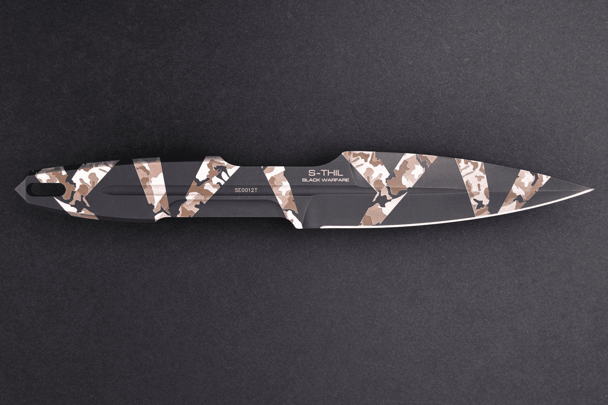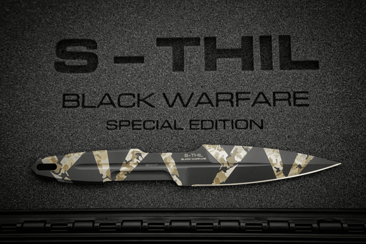 The Extrema Ratio S-THIL Black Warfare, special edition of the S-THIL model, is a backup tactical knife of monolithic construction milled out of a 5 mm (0.2”) bar of BOHLER N690 steel, developed in cooperation with designer Thilo Arnd Schiller. The spear point blade is heat treated to 58 HRC for best combination of edge retention and toughness. It has a false double edge to make it very effective in thrusting and piercing, and has a full length fuller that flows elegantly from the blade into the handle. The blade is milled integral to the knife for better compactness and lightness, with minimum thickness yet with a pattern that reminds of the classical Extrema Ratio knife grip. This profile creates two small guards and a comfortable thumb rest to prevent any chance the hand can slip towards the blade. On the pommel there is a diamond shaped skull crusher and a slot for a wrist strap or for giving the knife a paracord grip wrap. The Black Warfare special edition sports the innovative and original Geotech Camo pattern from Extrema Ratio, laser engraved into the surface of the knife. The stamped nylon sheath has been designed to be extremely flat and very narrow, to keep it as compact as possible. Knife design makes the sheath ambidextrous and allows to insert the knife with the edge on the left or the right. The integral twin retention system is composed of four pressure elements that work one pair at a time, according to the direction the knife is inserted, while the textile nylon part has a button and a strap to secure the knife to the sheath. The tip of the sheath has a hole to allow debris or liquids to be expelled simply by blowing into it. The sheath can be used with belt clip, ULTICLIP or malice clip making it extremely versatile, while it is also possible to attach it to a M.O.L.L.E. webbing just by weaving paracord through it. The Extrema Ratio S-THIL Black Warfare ‘Special Edition’ is delivered in a weather, dust and shock resistant Polypropylene IP67 certified waterproof case, with pressurization valve, which carries also the Nylon sheath, double ULTICLIP, double grit sharpening plate (ceramic and synthetic diamond).