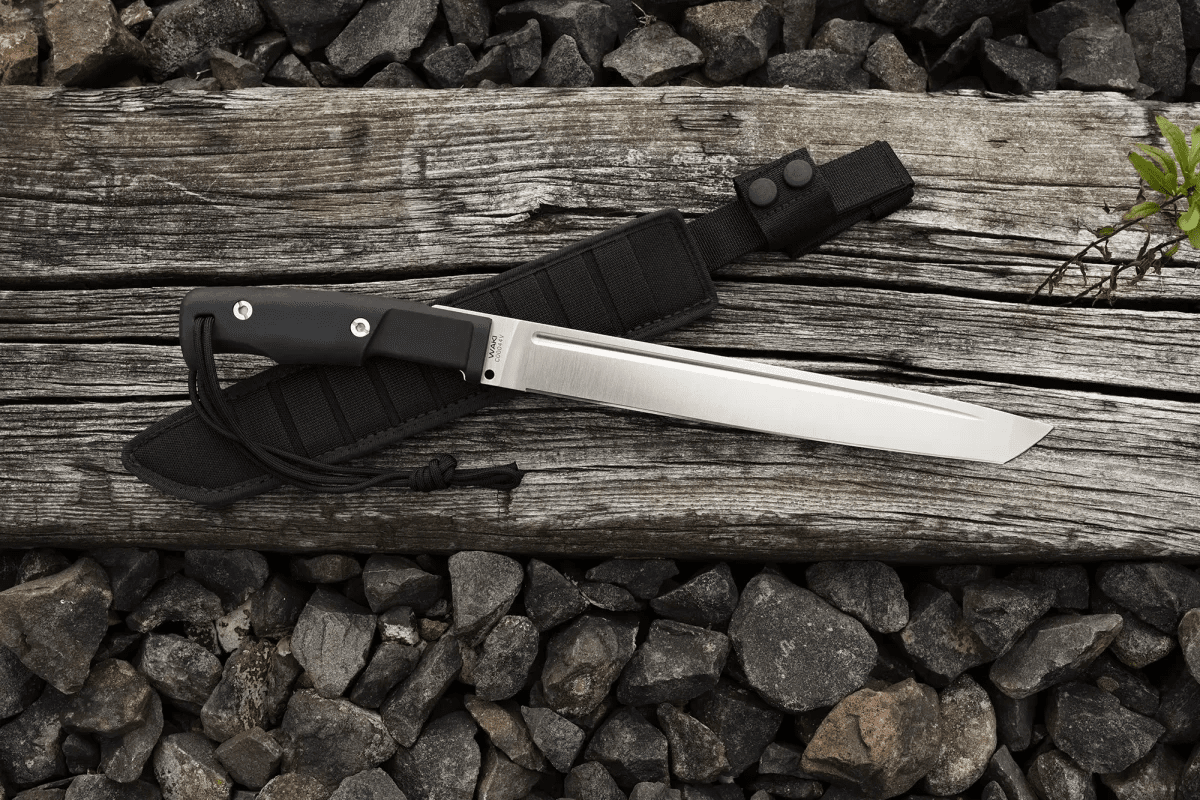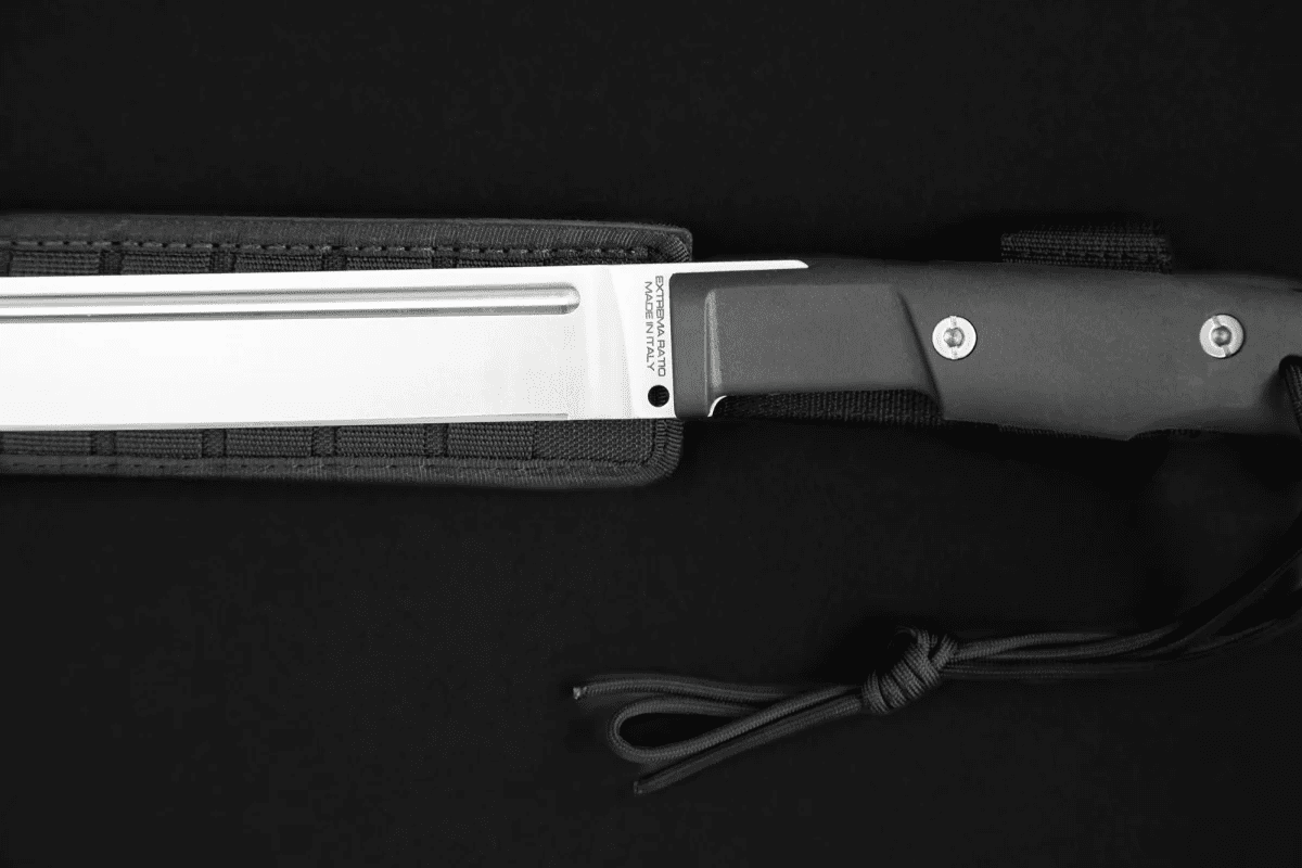 This product is an elaboration of the Japanese Wakizashi sword, a typical blade 30 to 60 centimeters long, which the Samurai always carried in contact with the body, whereas the Katana was carried exclusively in battle. The blade has the classic Japanese Tanto profile and is made of Böhler N690 steel with heat treatments that bring its hardness to 58 HRC for the best combination of edge retention and resistance. The blade, with flat grinding, has a precious satin finish. The black handle is made of forprene while the black cordura sheath is equipped with a MOLLE system that guarantees the transport of the extremely sharp blade in total safety, protecting it from impacts that could reduce its efficiency.