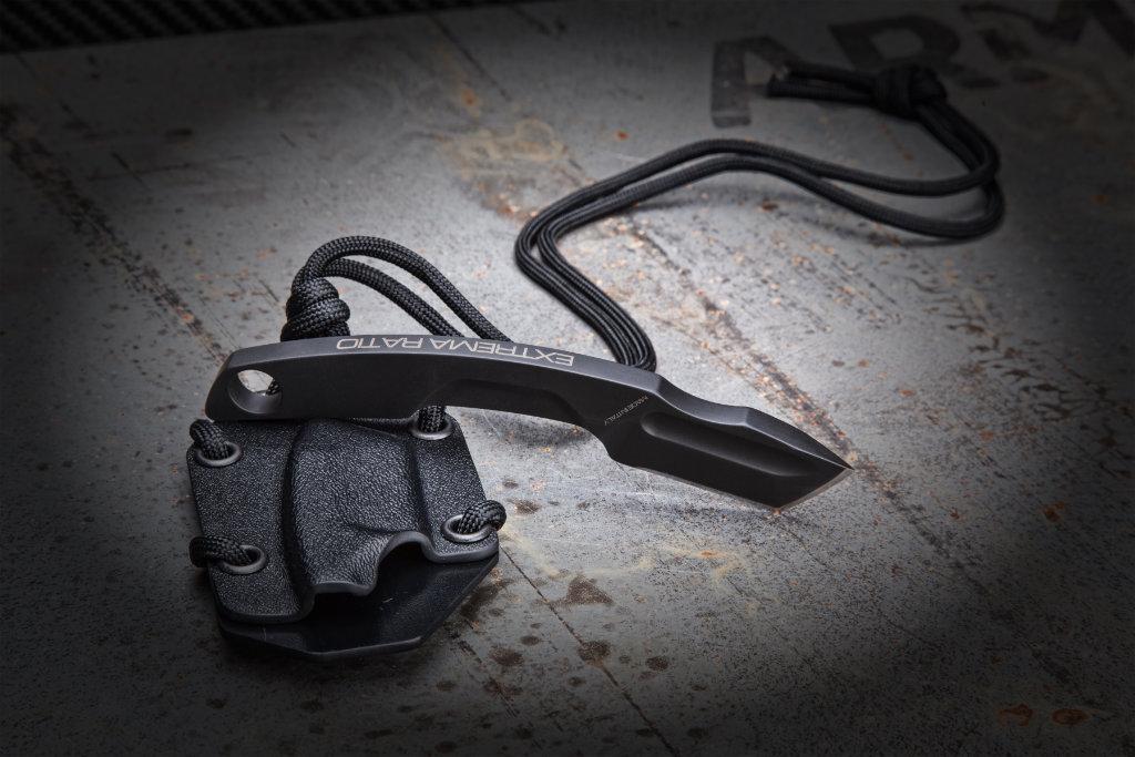 The N.K.2 is a small knife that expands the Extrema Ratio family of neck knives. It differs from the N.K.1 model in terms of blade size and blood-drain milling. The handle's ergonomics are designed to prevent accidental cuts during extraction from the sheath. A notch is made on the back for positioning the thumb or index finger depending on use. The knife's structure allows for very effective cutting as well as small precision work.