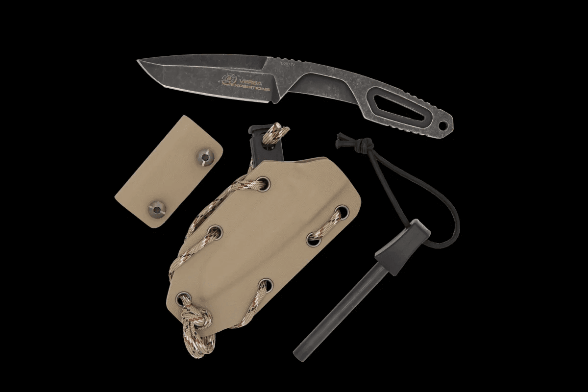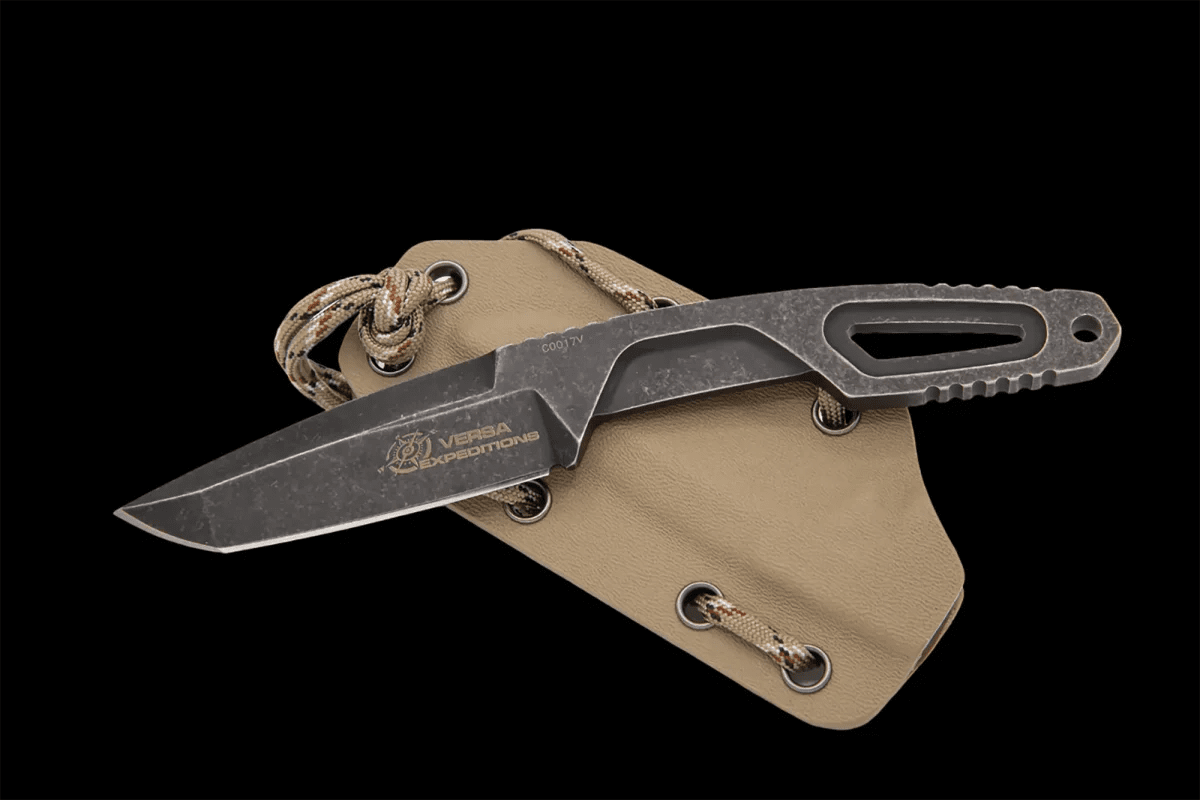 Both models are made of Böhler N690 steel heat treated to 58 HRC: the Satin version has a satin blade and a black thermoformed kydex sheath while the Expeditions version features a MIL-C-13924 browning and a stone washed finish (Dark Stone). Versa Expeditions comes with a desert-colored thermoformed kydex sheath on which you can attach the Firesteel to light fires (included in the package). Versa is a fixed blade knife with a monolithic structure, machined from a single piece of Bohler N690 steel. The ergonomics are designed to ensure maximum comfort and safety during use.