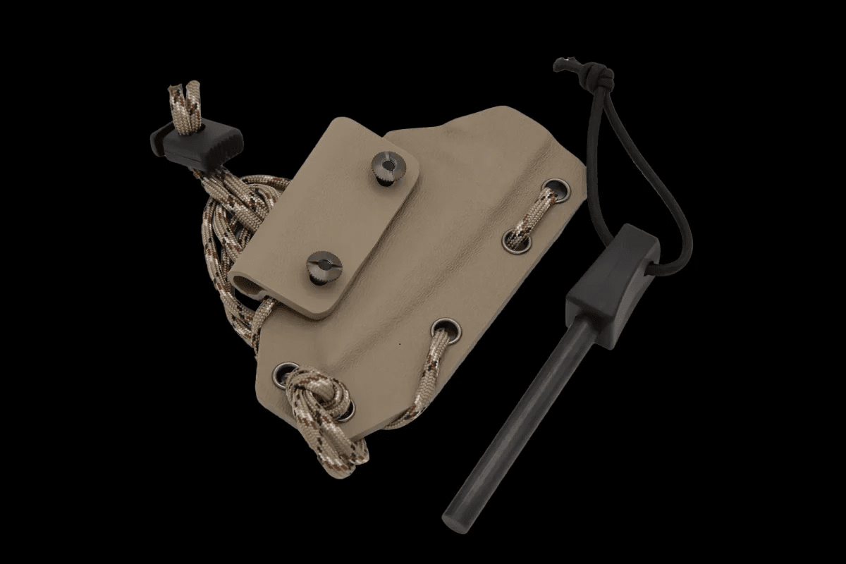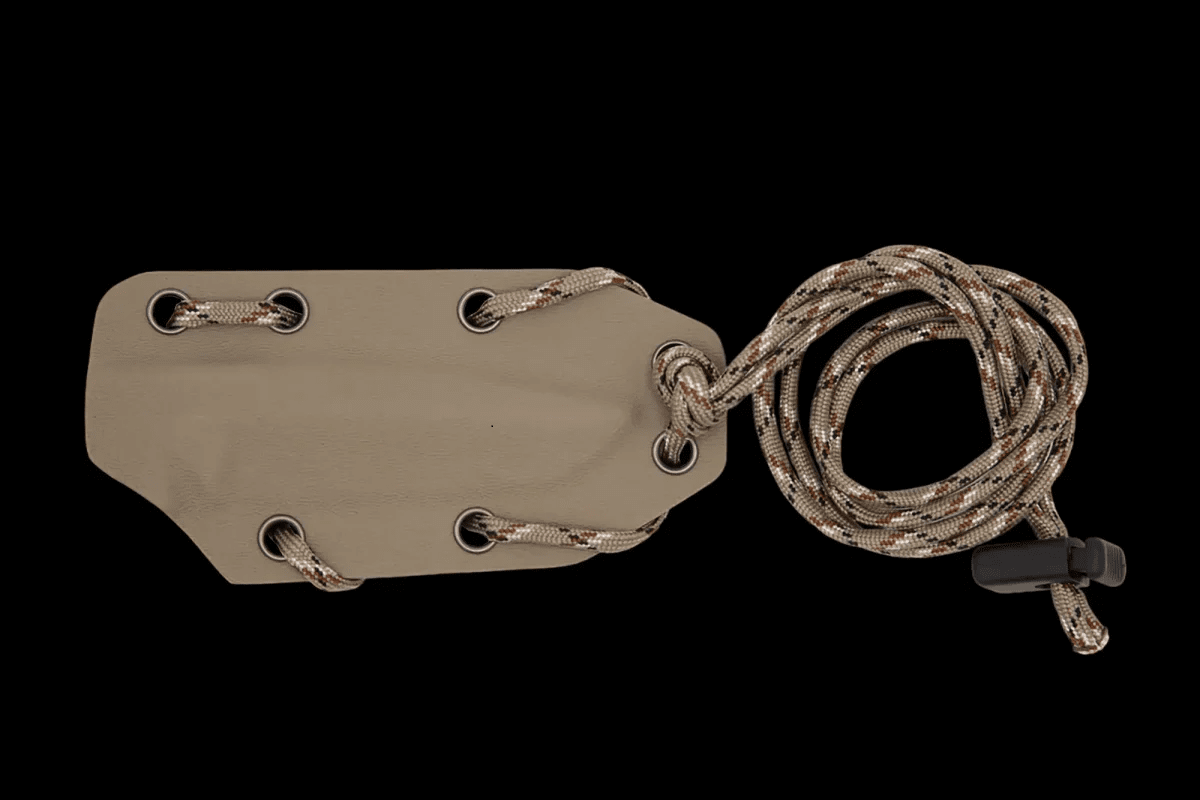 The skeletonized full-tang structure allows the user to customize the handle by covering it with paracord, further expanding the possibilities of use and customization of the knife. The total length is 180 mm with a Tanto profile blade. The Kydex sheath is designed for quick and safe extraction of the blade.
