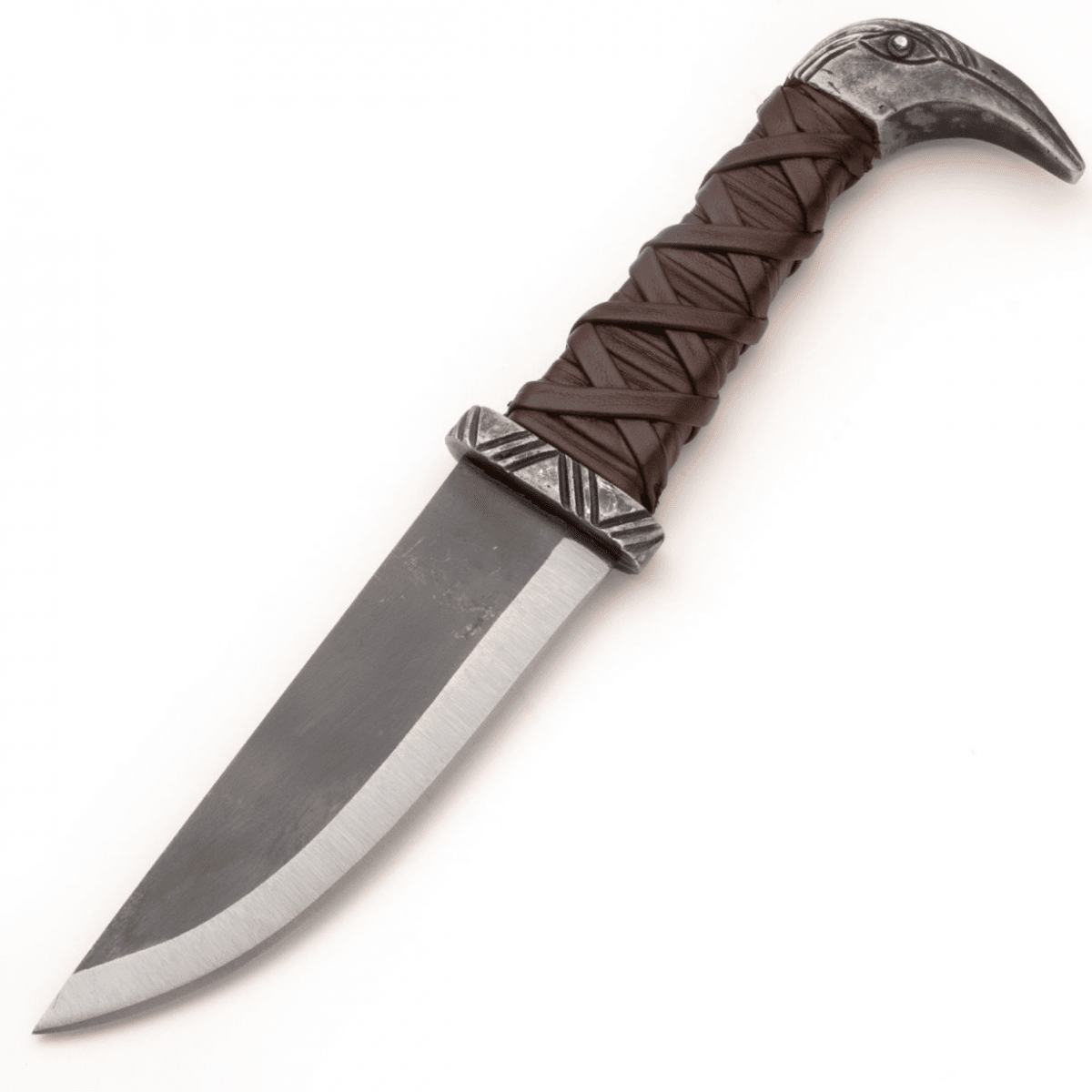 The raven head pommel, the guard, and the pommel have a rough-forged finish that looks fresh out of the dwarves' smithy.