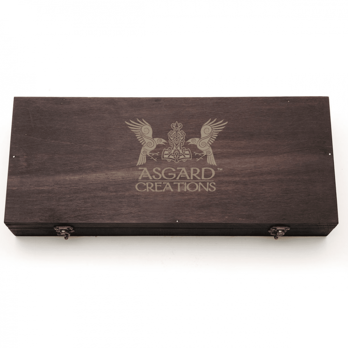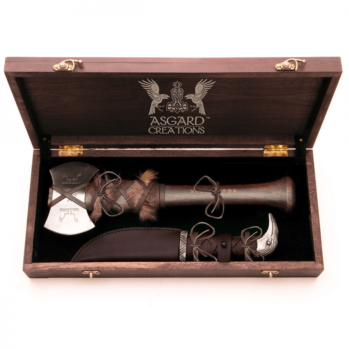 Here's a gorgeous set of "belt tools" inspired by Norse mythology, attractively stored in an "Asgard Creations" gift/display box.