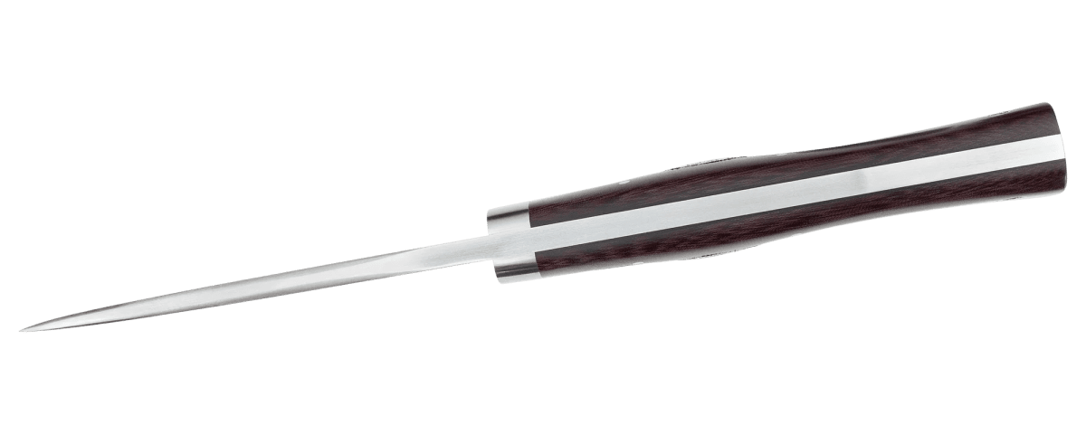 We take pride in making exclusive knives that not only offer flair and beautiful lines, but are also usable. The well-crafted laminated powder steel (3G) blade with a core of SG2 is not only beautiful, it is also strong and holds its sharpness really, really well. We therefore hope that this completely handmade hunting knife will not be lying in a glass case without the knife being used – practical luxury!