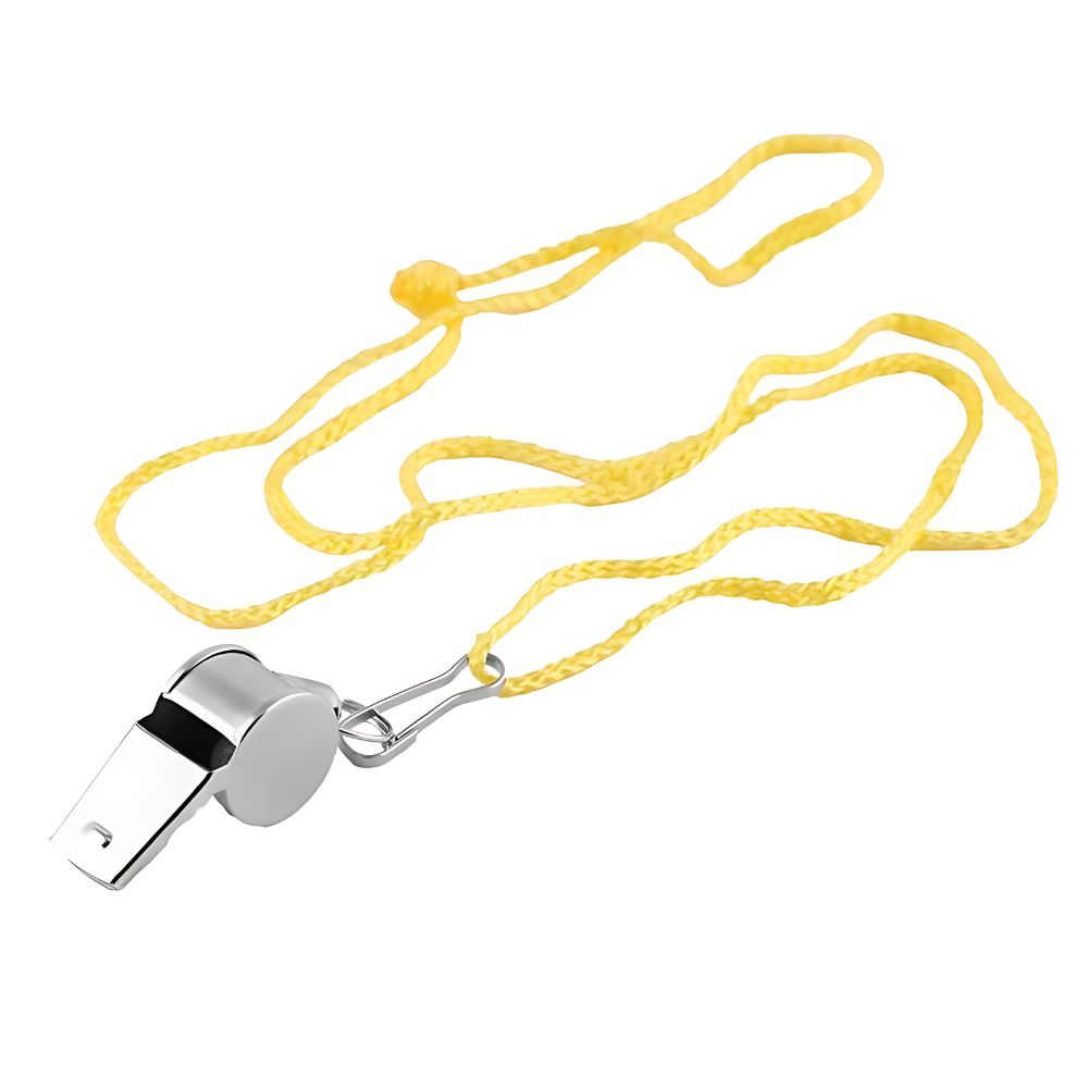 Nickel-plated whistle with lanyard.