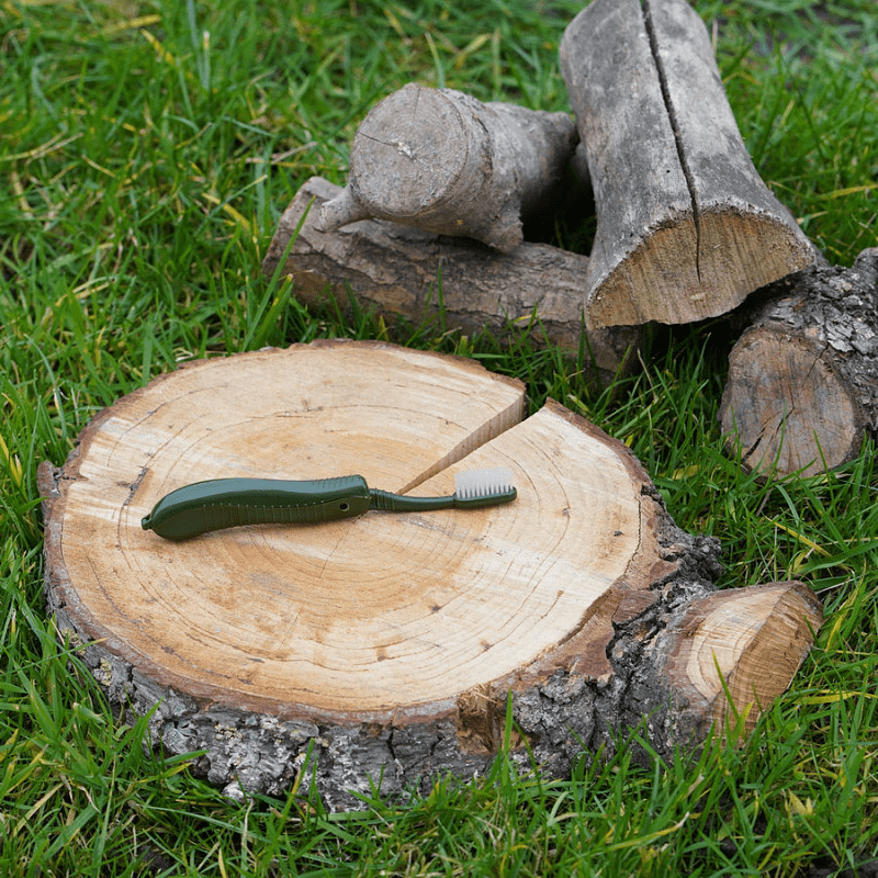 Practical camping toothbrush for folding. The folding toothbrush is ideal for on the go. Using a rotary mechanism, the brush can be stored in the handle. The folding toothbrush is made of 100% plastic.