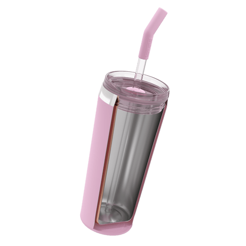 The Helia tumbler made of 18/8 stainless steel keeps drinks cold for up to 17 hours and hot for 3 hours and comes with a glass drinking straw.