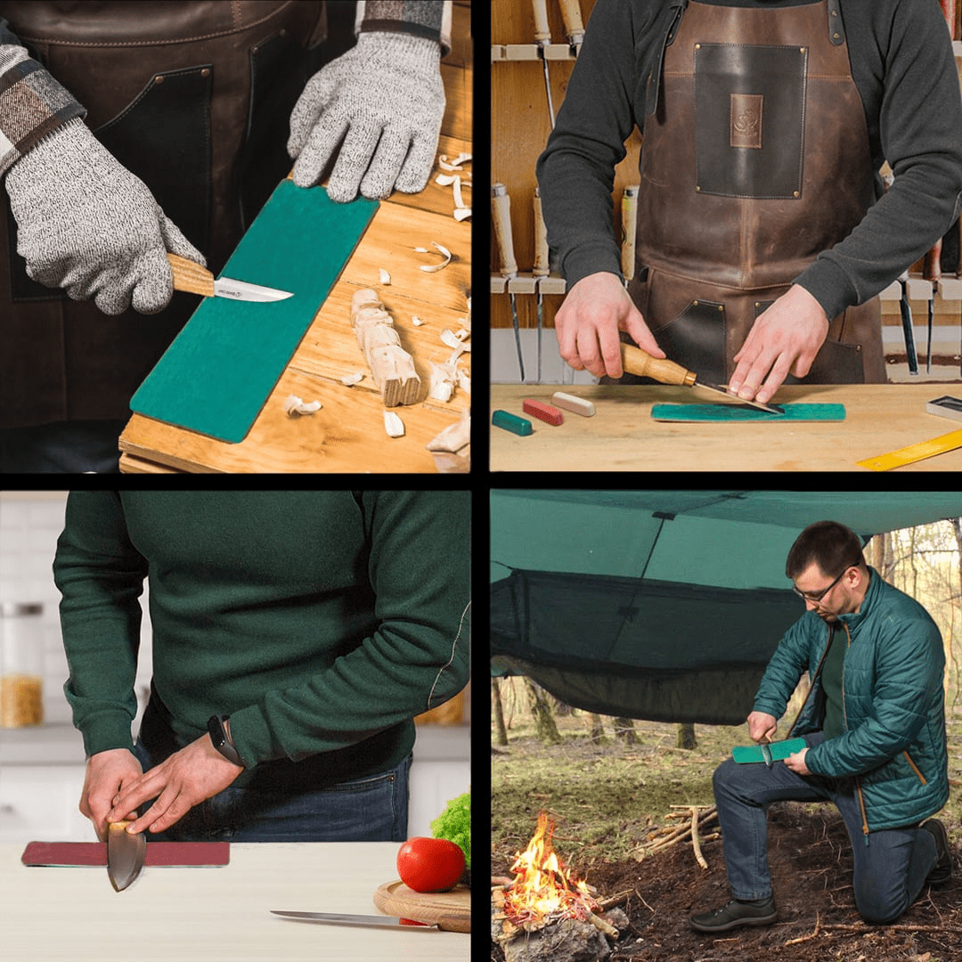 This set has 3 individual polishing compounds and 1 leather strop that will allow you to do all the needed work with your instruments to reach perfection. This knife sharpener strop has two leather sides, one more smooth and one more rough. The size is 75x310mm! All this for your knives to get sharp and shining.