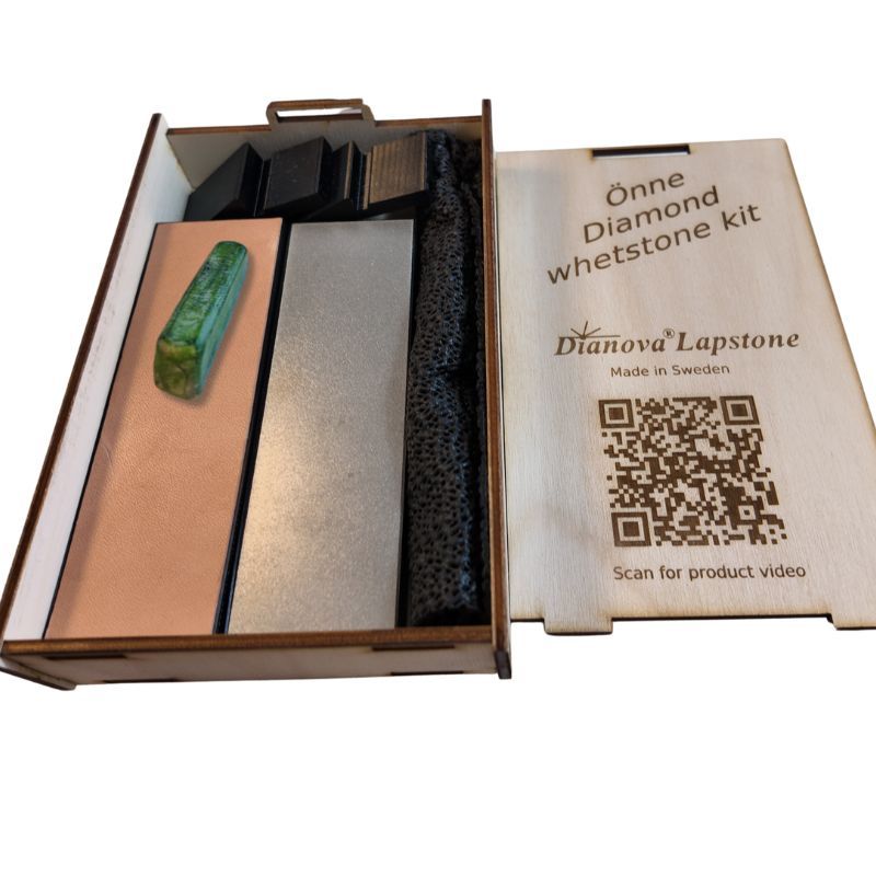 The Önne diamond sharpening kit consists of two double-sided sharpening stones with three different diamond grades and one side of leather for sharpening.