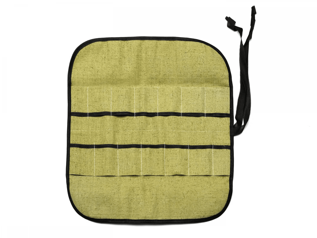 This tool roll is designed for storing knives, woodcarving chisels and other small tools. The tool storage is made of canvas and stitched with a strong thread. The roll for gouges doesn’t take much space, you can easily carry it in hands, in your backpack or working apron. If the canvas tool wrap with tools is dropped, the tools won’t get broken.