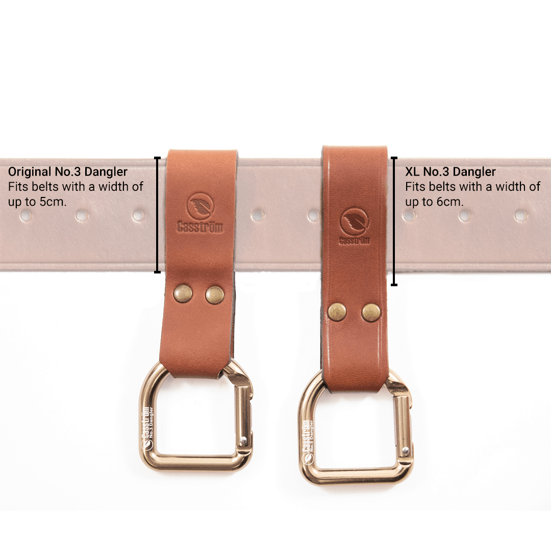 The belt loop is made of sturdy 3mm thick vegetable tanned cowhide available in Cognac Brown, Black or Dark brown. The loop can take belts with a width up to 5cm. The Dangler's D-ring will take knife sheaths with a belt loop up to 34mm wide.