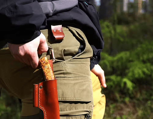 We have also designed the D-ring as a carabiner and thus opened up many new features and applications. You can easily take the knife off without having to open your belt, you can easily move the knife to your backpack for example, or just quickly take it off if you are approaching a populated area. The D-ring is made of sturdy 8mm thick aluminum and in tests the breaking strength has exeeded 400kg which means that you can use it for lots of different purposes, for example, to hang up the equipment, pull an animal or anchor a dog leash to your waist. It can also be used for suspending a tarp or hammocks.