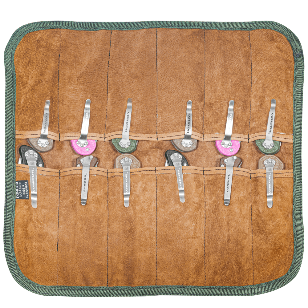 Condor Tool & Knife is expanding its original Carry Knife Roll with the new Condor Carry Folder Roll and Condor Carry Machete Roll. Keep your most cherished knives, folding knives, and machetes well-protected and readily available for transport using our Condor Carry Roll Series. Its pockets are fully lined with leather and a canvas cover to resist tearing and damage. These bags are designed with the stylish collector in mind, providing a convenient and protective solution for carrying and safeguarding essential tools and knives all in one place.