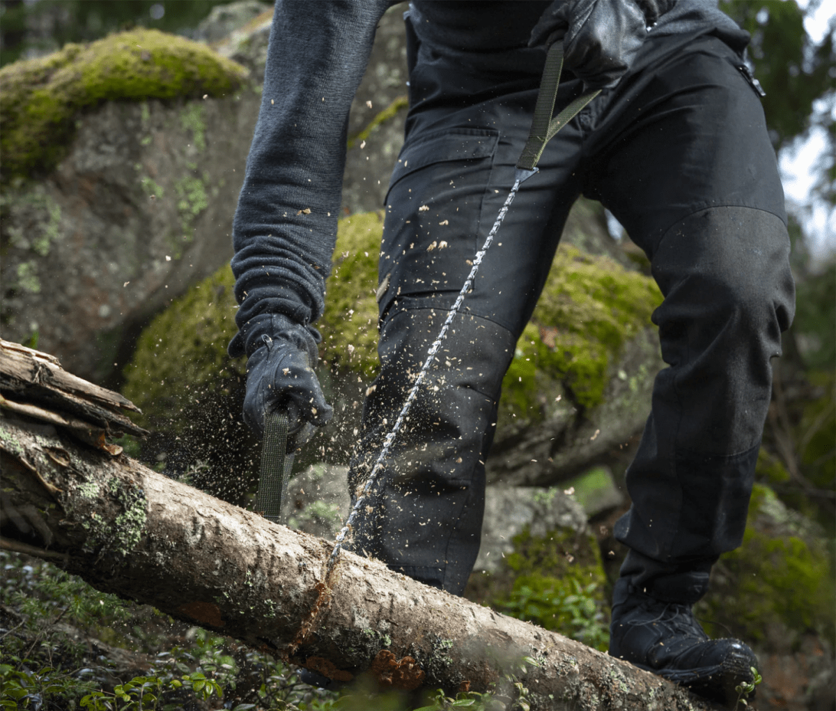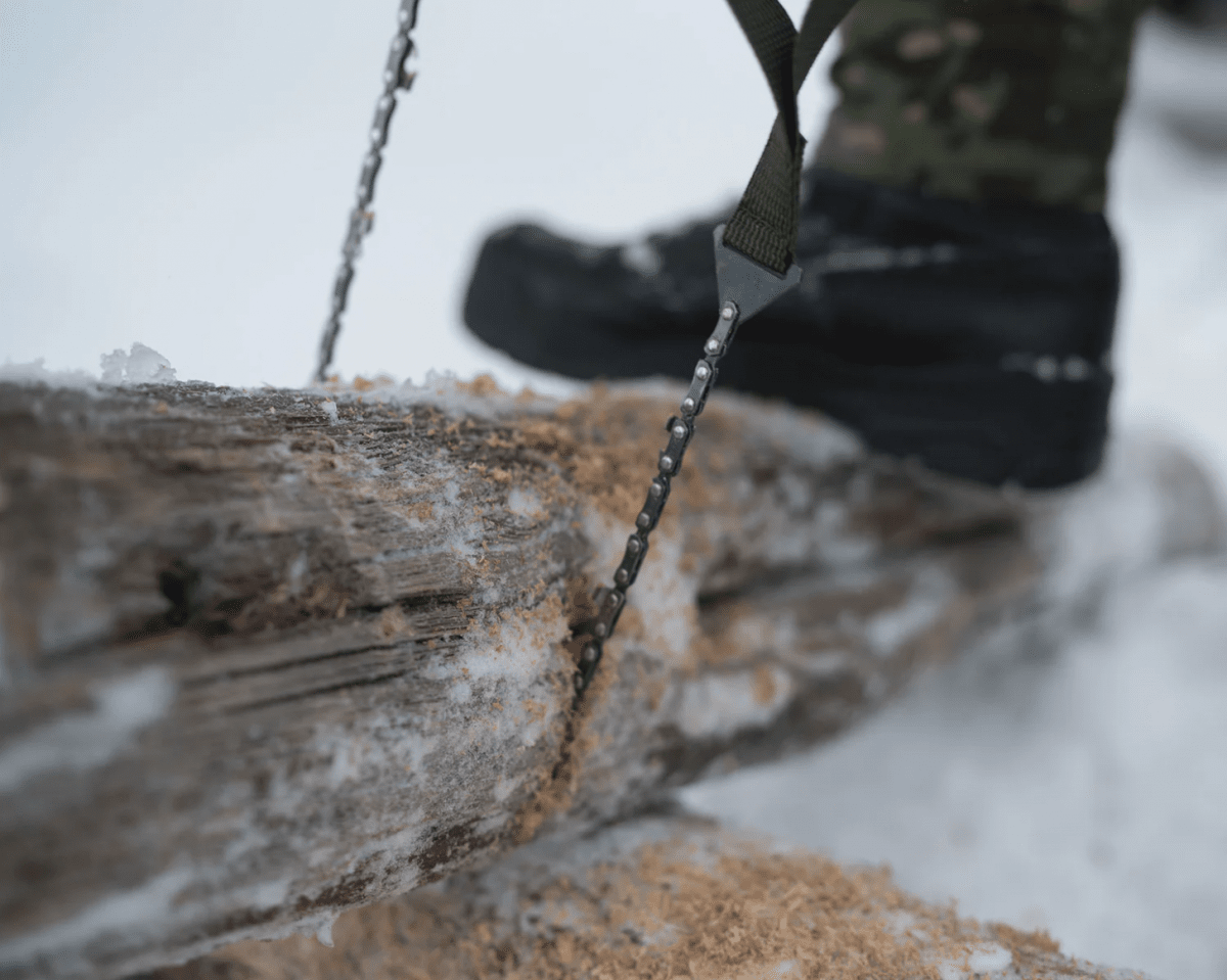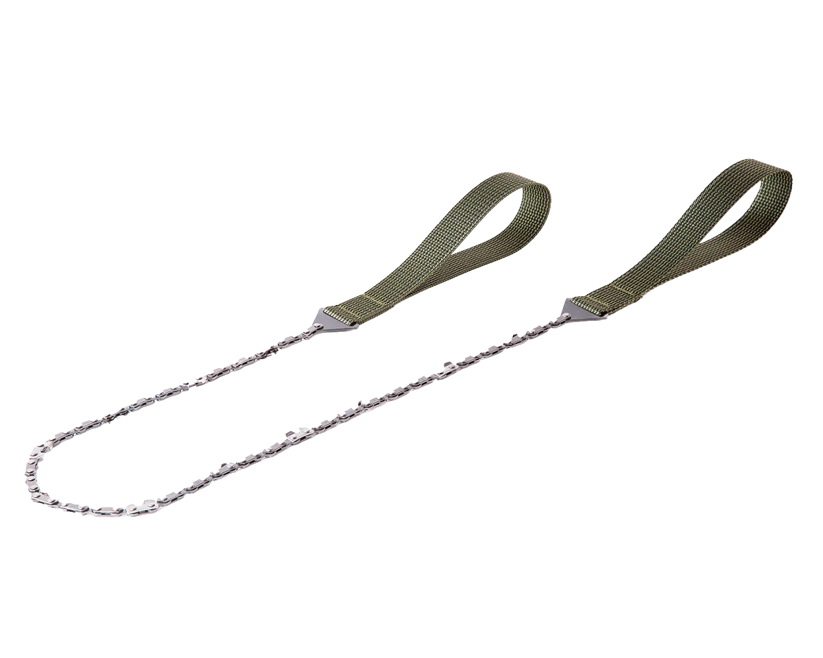 This tool features a chainsaw blade with wide webbing loops that provide a solid grip, even in freezing temperatures with thick gloves on—because nobody wants to be barehanded at -30°C. The blade cuts efficiently in both directions, making full use of your body’s natural motion and muscle groups for fast, effective sawing.