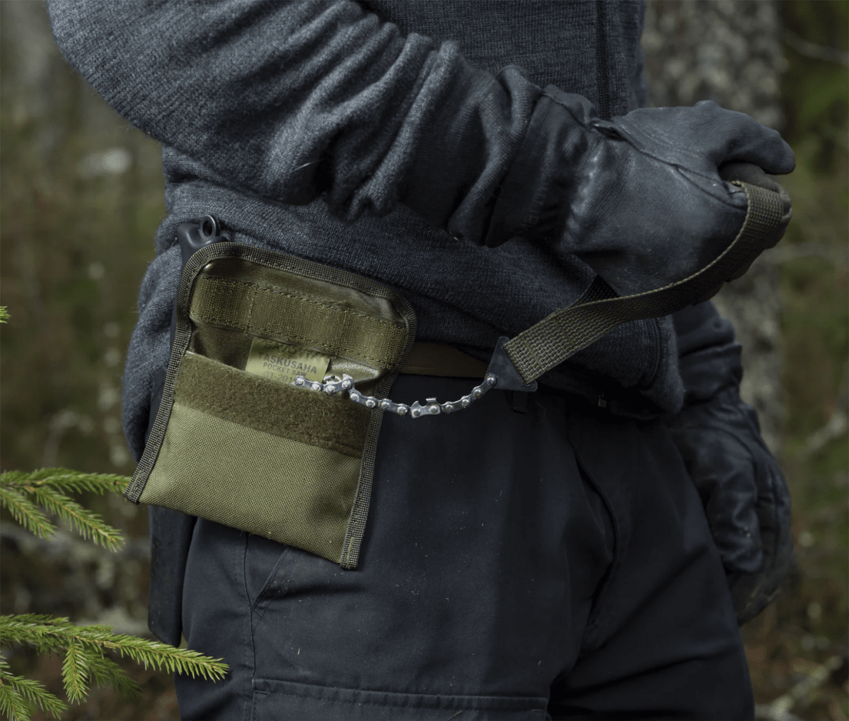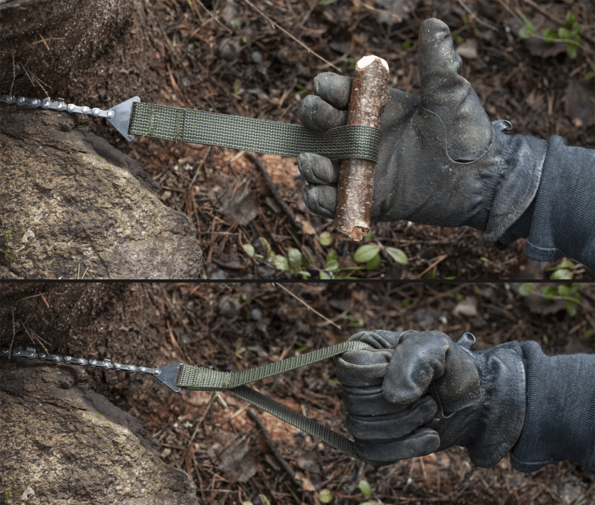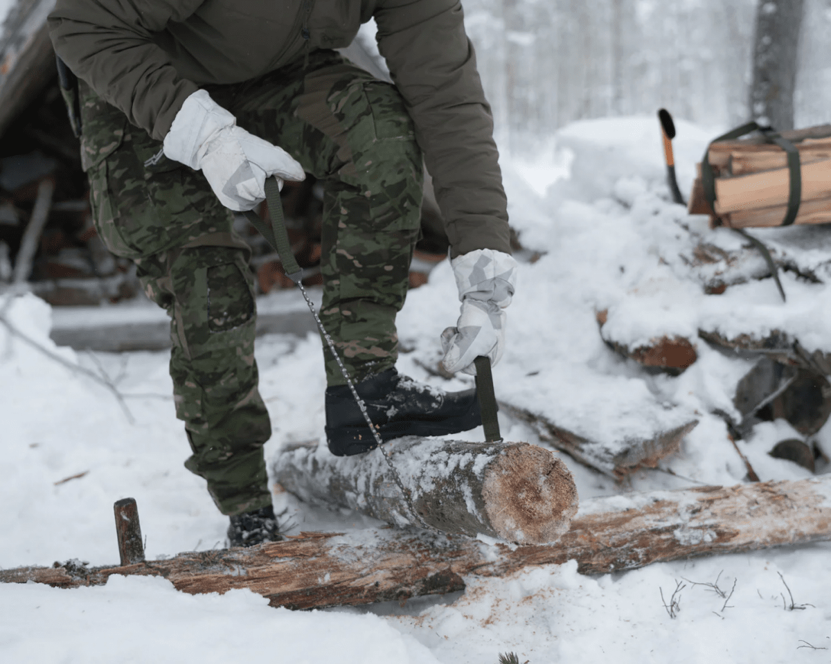 This tool features a chainsaw blade with wide webbing loops that provide a solid grip, even in freezing temperatures with thick gloves on—because nobody wants to be barehanded at -30°C. The blade cuts efficiently in both directions, making full use of your body’s natural motion and muscle groups for fast, effective sawing.
