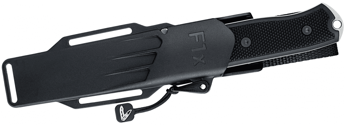 Vi har i vanlig ordning lagt mycket energi på att utforma en säker knivslida, det är ju faktiskt där som kniven kommer att tillbringa sin mesta tid. Slidan avgör accessen till kniven och här har vi verkligen satt till alla klutar för att få fram en säker slida som medger en enkel tillgång till kniven. Slidan har både ett transportlås (vikbygeln med en stropp) och en platssäkring som gör att kniven sitter säkert i slidan tills du bestämmer dig för att använda den. Det är lite av både livrem och hängslen men vi gillar den säkerhetsattityden – en tappad kniv gör ingen nytta. Transportsäkringen medger därför att kniven kan fästas upp och ned på kroppen eller på din utrustning utan risk.