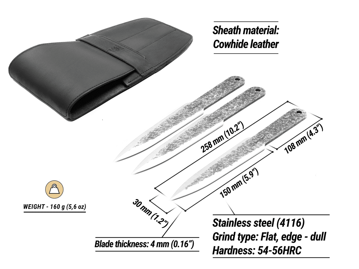 Tillverkade av högkvalitativt X50CrMoV15 rostfritt stål, erbjuder dessa knivar exceptionell hållbarhet och motståndskraft mot slitage. Varje kniv är noggrant formad, vilket säkerställer ett jämnt och exakt kast varje gång. Bladen har en vass spets för exakt penetrering.