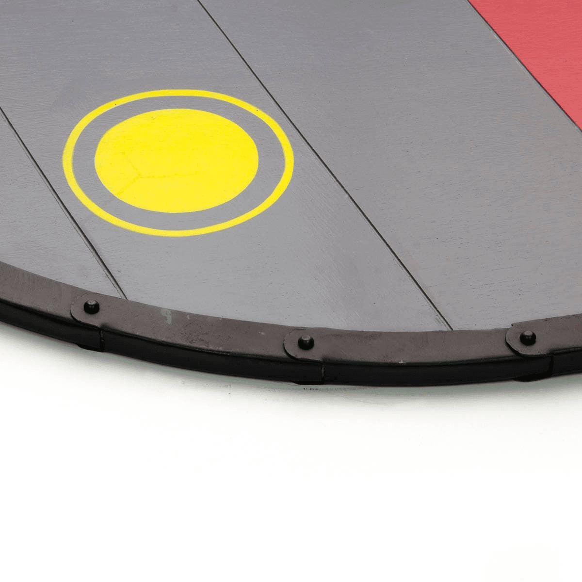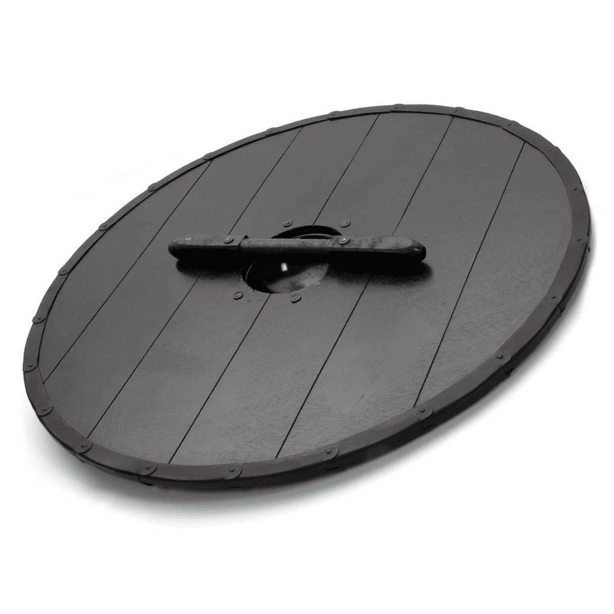Denna handmålade vikingasköld är gjord av individuella plankor på samma sätt som originalen. Metallen överlappar på kanten vid nitpunkterna för starkare konstruktion. Skölden har en stålbuckla för att skydda handen och ett trägrepp.