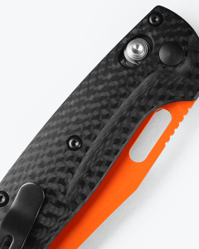 - Synlighet: Den orangea Cerakote-finishen och anodiserade detaljer gör kniven enkel att hitta, även i utmanande förhållanden.