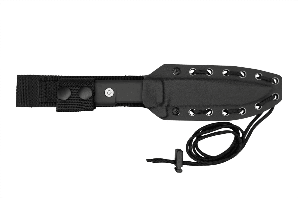To complete the system, a sheath with adjustable textile extension for attachment to the belt and paracord for leg looping, compatible with accessories that allow multiple transport configurations: