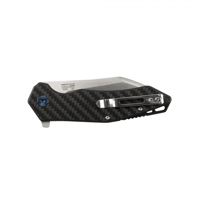 The handle of the Firebird FH31 CF knife consists of a steel strip and a pair of carbon fiber pads. This material has a composite structure, due to which it has a very high strength and long service life. Nevertheless, the weight of carbon fiber is comparable to ordinary plastic. It also does not absorb water and does not fade in the sun. The clamping clip is placed on the handle of the knife, and there is a small hole to be able to thread lanyard.