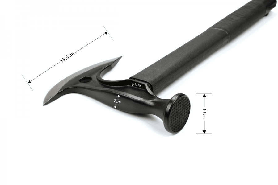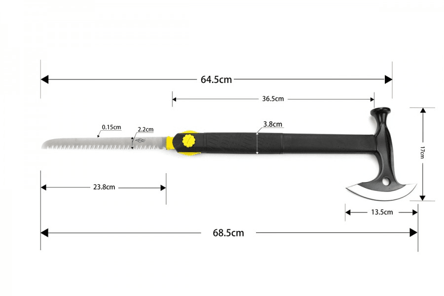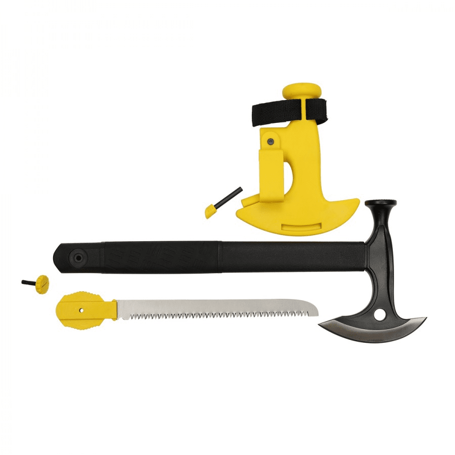 Multifunktionell yxa med hammarhuvud, denna modell har även en inbyggd såg i handtaget. Tändstål ingår.En bra produkt att ta med på campingturen, på skotern eller i bilen.