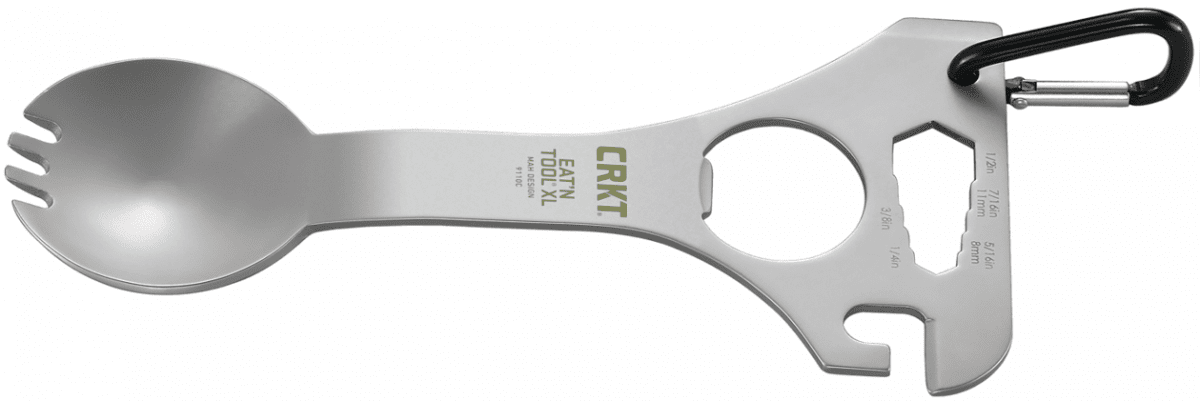 Ja, det finns en ergonomisk sked och en kortjusterad gaffel. Men dessutom finns det en praktisk flasköppnare på ena sidan för din öl som passar till middagen.den högra sidan av handtaget är slipad för att ge ett nödskruvmejselblad och fungerar även som ett bände för att öppna behållare. Slutligen är tre metriska nyckelar (10 mm, 8 mm, 6 mm) användbara för akuta reparationer.