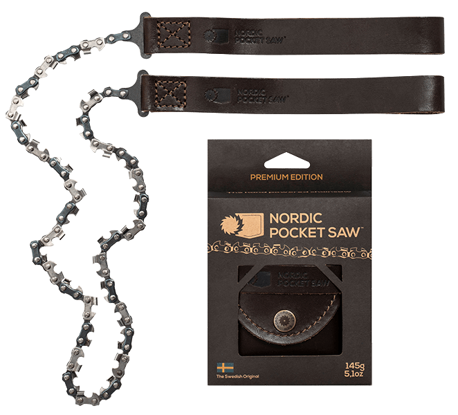 Premium-versionen har samma storlek som Nordic Pocket Saw Original, men nylonet har ersatts med ekologiskt garvat läder från Sverige. Lädret kommer från Tärnsjö Garveri, som är ett av få garverier i världen som fortfarande levererar vegetabiliskt garvat läder. Lädergarvning har varit känt för människor i tusentals år och initialt utfördes det med hjälp av oljor baserade på växter. Numera tillämpar många garverier en krombaserad garvningsprocess på grund av dess kostnadseffektivitet och för att det går snabbare, men det är också känt för att vara mindre miljövänligt. Studier har även visat att läder garvat med krombaserade oljor kan orsaka allergiska utslag hos människor som kommer i kontakt med det. När du äger en Premium-version kan du stolt skryta med att ha en produkt med läder som garvats med samma metod som man använde för tusentals år sedan.