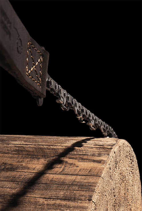Premium-versionen är främst designad för att såga på egen hand. Men när du kapar större grenar och stockar kan du även använda den här sågen tillsammans med en vän. Den fungerar bäst för grenar med en tjocklek på cirka 10 cm, men den kan även hantera bitar som varierar från 3-45 cm i diameter. Om du kapar pinnar och grenar som är tunnare än 3 cm rekommenderar vi istället att du använder en av våra fällbara sågar. Kedjan är 65 cm lång och tillverkad av värmebehandlat kolstål med 33 tänder riktade mot varandra för att säkerställa optimal prestanda vid användning.